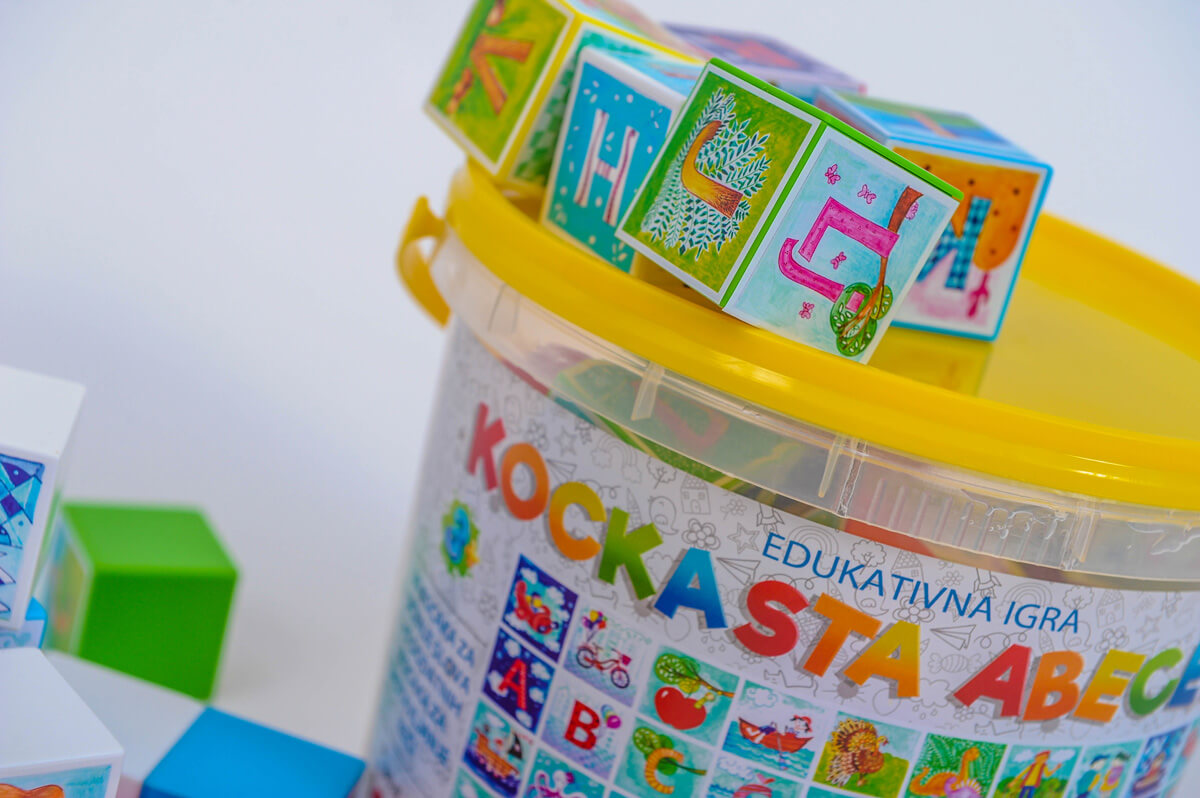 Pakovanje sadrži 35 kocaka u 5 različitih boja. Na 30 kocaka sa jedne strane je slovo a sa druge određeni pojam za to slovo. Na strani gde je slovo kocka se može otvoriti kako bi igra traženja slova bila još zanimljivija a na dodatnih 5 kocaka je po 6 slova kako bi mališani lakše sklapali svoje prve reči. Dimenzije kocaka su 40 x 40 x 40 mm. Kockasta abeceda je napravljena od plastike koja je potpuno bezbedna za decu što potvrđuje izveštaj Instituta za javno zdravlje Vojvodine. Dečija mašta je uputstvo za upotrebu 🙂